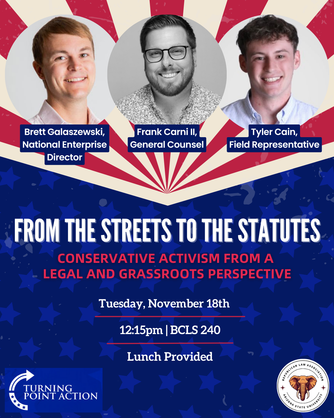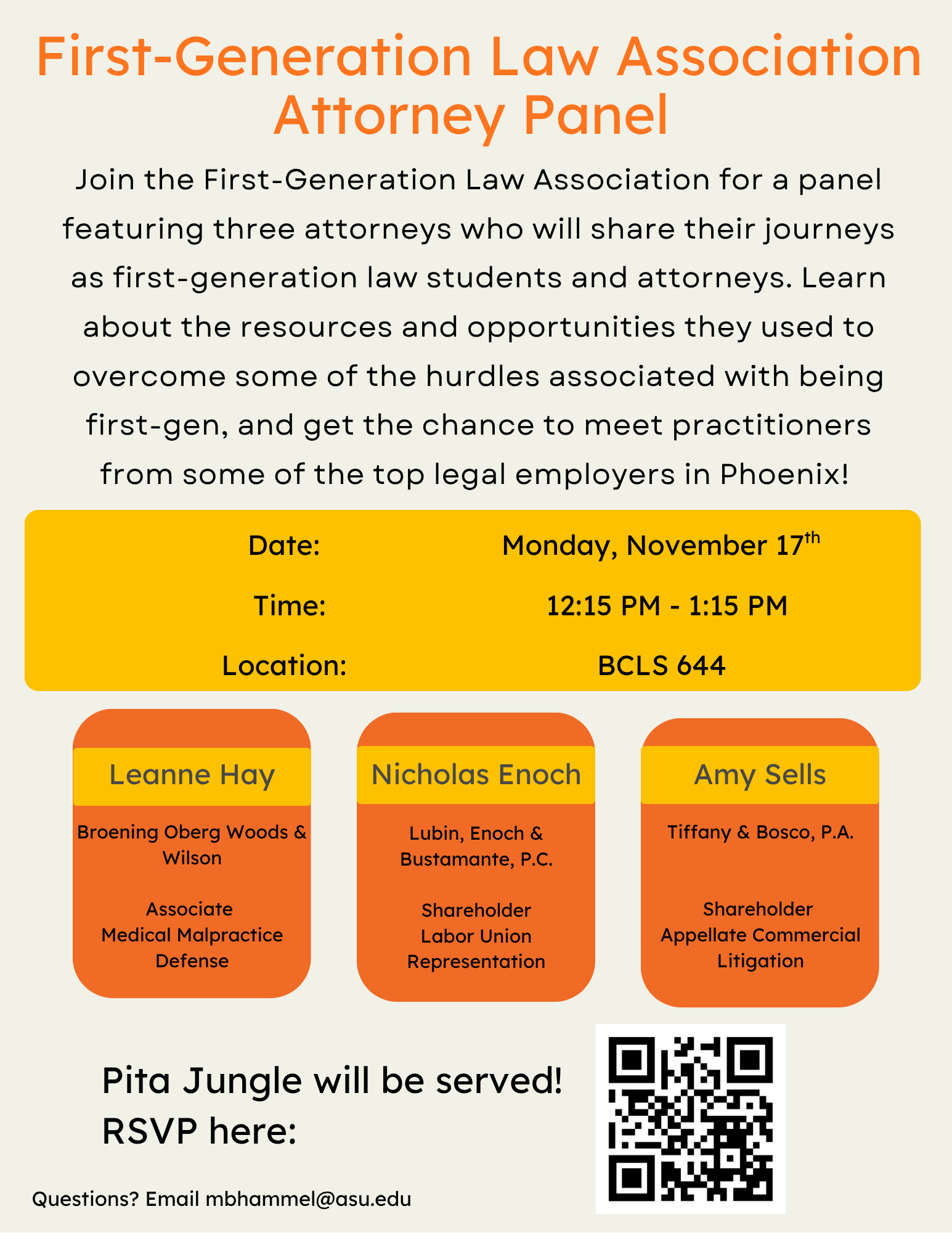 Calendar of Events Categories Admissions Alumni Event ASU Law Leadership Bar Exam Success Career Services Centers & Programs CLEs & Conferences Deans' Events Development External Event Faculty Event Financial Aid General Holiday Information Technology Invite Only Journals Law Library Los Angeles Presentations and Panels Pro Bono Organizations Staff Event Student Life Student Organizations Student Services Washington D.C. Audience External Public Alumni Students Faculty Staff Invite Only Date Date Today Tomorrow This Weekend Date Start date Start date Search Reset Filters Applied Filters None View 16 Nov Dutch American Heritage Day Sun, Nov 16, 2025, 12:00 am – 11:59 pm (MST) 17 Nov Navigating the Changing Landscape for International Students Mon, Nov 17, 2025, 12:15 pm – 1:15 pm (AZ) BCLS 650 17 Nov 1L Civ Pro Review Mon, Nov 17, 2025, 12:15 pm – 1:15 pm (AZ) BCLS 442 17 Nov First-Generation Law Association Attorney Panel Mon, Nov 17, 2025, 12:15 pm – 1:15 pm (AZ) BCLS 644 18 Nov OCI Panel Tue, Nov 18, 2025, 12:00 pm – 1:00 pm (AZ) Room 546 18 Nov Sustainability Law Research Fellows Open Presentations Lunch Tue, Nov 18, 2025, 12:00 pm – 1:30 pm (AZ) BCLS 544 18 Nov From the Streets to the Statutes: A Legal Look at Conservative Activism Tue, Nov 18, 2025, 12:15 pm – 1:15 pm (AZ) BCLS 240 18 Nov AZ Character & Fitness Info Session Tue, Nov 18, 2025, 12:15 pm – 1:15 pm (AZ) BCLS 450 18 Nov ACS: Getting to Know Arizona Court of Appeals, Division One's Newest Judges' and Their Paths to the Bench Tue, Nov 18, 2025, 12:15 pm – 1:15 pm (AZ) BCLS 442 18 Nov You Be the Jury! Volunteer for the Civil Litigation Clinic’s Mock Trial (Earn Pro Bono Hours!) Tue, Nov 18, 2025, 1:35 pm – 3:00 pm (AZ) BCLS Room 655 18 Nov Speedy Trial Tuesdays with RCAL Tue, Nov 18, 2025, 6:15 pm – 7:30 pm (AZ) BCLS Breezeway 19 Nov Writing Workshop with Michele Feeney Wed, Nov 19, 2025, 11:30 am – 1:30 pm (AZ) Virtual 19 Nov Oral Arguments and Panel Discussion with Arizona Court of Appeals Wed, Nov 19, 2025, 12:00 pm – 1:30 pm (AZ) BCLS W. P. Carey Armstrong Great Hall 19 Nov Fall 2025 Selig Speaker Series Wed, Nov 19, 2025, 6:00 pm – 7:15 pm (AZ) Great Hall (Room 141) 20 Nov 1L Meet the Employer for Summer 2026 Thu, Nov 20, 2025, 12:00 pm – 1:30 pm (AZ) BCLS 544 20 Nov Character & Fitness for Other Jurisdictions Thu, Nov 20, 2025, 12:15 pm – 1:15 pm (AZ) BCLS 450 20 Nov You Be the Jury! Volunteer for the Civil Litigation Clinic’s Mock Trial (Earn Pro Bono Hours!) Thu, Nov 20, 2025, 1:35 pm – 3:00 pm (AZ) BCLS Courtroom (546) 21 Nov SALDF Animal Shelter Donation Drive Fri, Nov 21, 2025, 8:00 am – 5:00 pm (AZ) 4th Floor Lobby (by the elevators) 21 Nov You Be the Jury! Volunteer for the Civil Litigation Clinic’s Mock Trial (Earn Pro Bono Hours!) Fri, Nov 21, 2025, 1:35 pm – 3:00 pm (AZ) BCLS Courtroom (546) 24 Nov Holiday Recharge: Yoga & Mindfulness with Dean Leeds Mon, Nov 24, 2025, 12:00 pm – 1:00 pm (AZ) BCLS 544 24 Nov The Law Student Book Club at ASU November Meeting Mon, Nov 24, 2025, 12:15 pm – 1:15 pm (AZ) BCLS 546 25 Nov Canby Lecture Tue, Nov 25, 2025, 12:00 pm – 2:00 pm (AZ) BCLS 141 Great Hall 27 Nov Thanksgiving Holiday Thu, Nov 27, 2025, 12:00 am – 11:59 pm (MST) 28 Nov Thanksgiving Holiday Fri, Nov 28, 2025, 12:00 am – 11:59 pm (MST) 8 Dec Immaculate Conception Mon, Dec 8, 2025, 12:00 am – 11:59 pm (MST) Prev Next